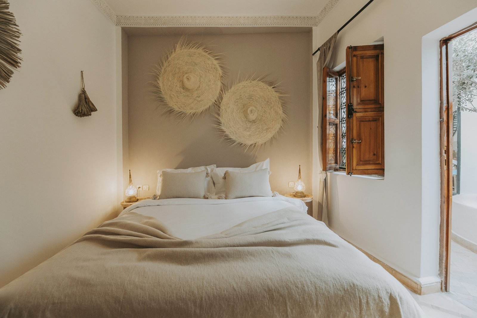 Flooded with natural light and open to the calm patio, this room is a perfect hideaway for two, combining quiet elegance with a touch of Moroccan authenticity.